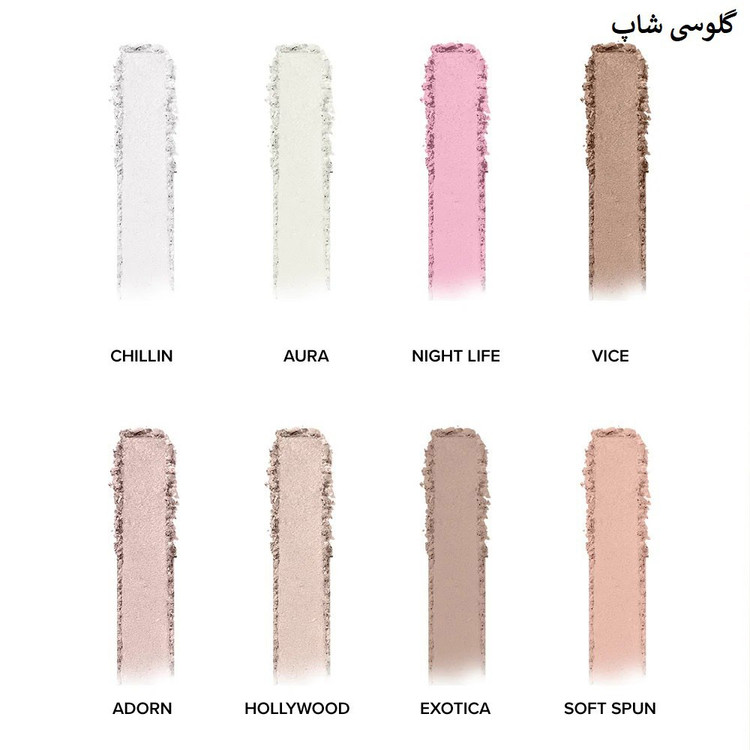 این پالت شامل ۸ رنگ متنوع با شاینهای طلایی، نقرهای و هلوگرامی است که برای انواع رنگ پوست مناسب میباشد: